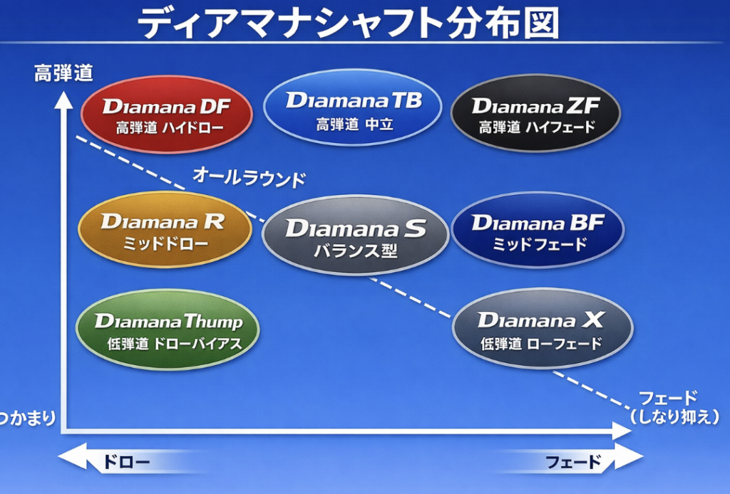 ディアマナシリーズのシャフトには、それぞれのモデルごとに異なる調子(キックポイント)、設計思想、プレーヤー対象が存在します。種類によって弾道の高さ、スピン量、打ち出し角、球のつかまり具合が大きく異なるため、正しい理解が必要です。