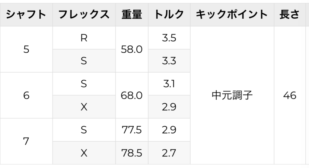- フレックス選択可能:5S〜6Xでヘッドスピードやスイングに合わせて選択可能。