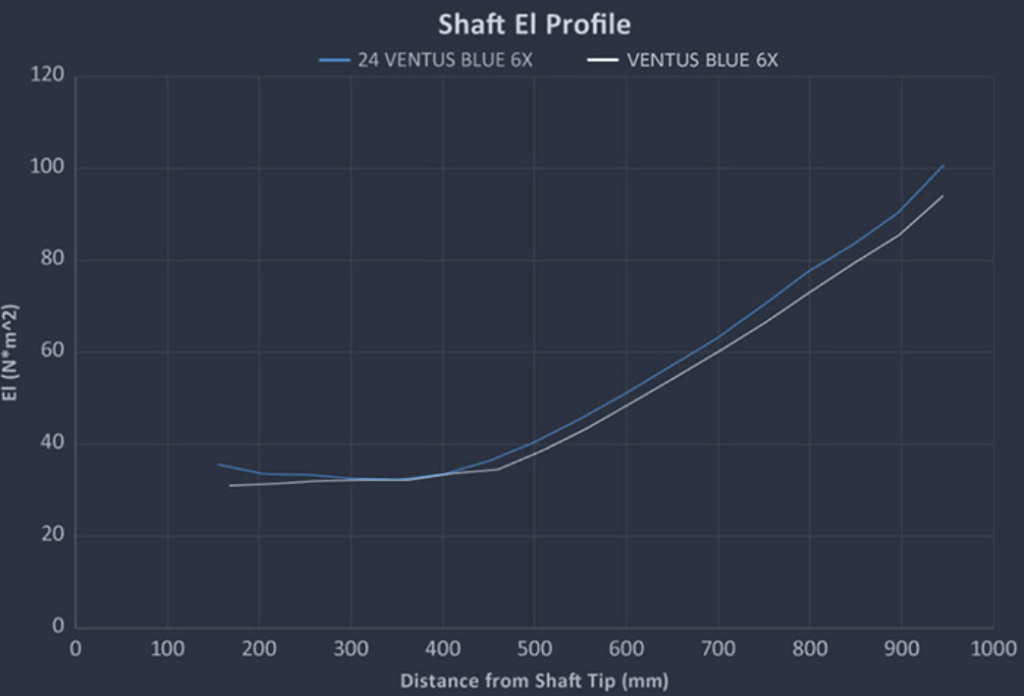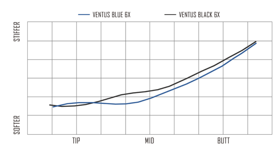 ベンタスシリーズを理解するうえで重要なのが「剛性分布図」です。剛性分布図とは、シャフト全体のどの部分が硬く、どの部分が柔らかいかをグラフ化したもので、スイング時のしなり方や弾道の高さ、方向性に直結します。ベンタスでは、ブルー・グリーン・ホワイトといったモデルごとに剛性分布が大きく異なります。