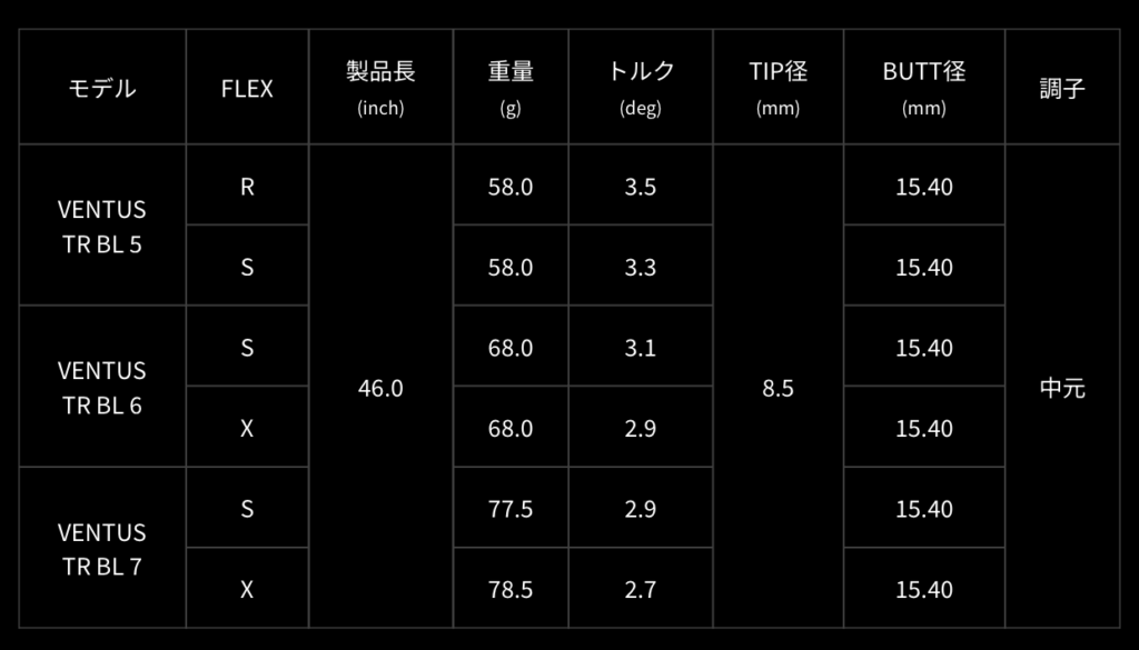 TRシリーズは、従来のVENTUSよりもややシビアな設計ですが、その分「安定性」「方向性」を重視するゴルファーに最適です。ヘッドスピードの目安はモデルによりますが、TR Redは中級〜上級者向け(ヘッドスピード43〜48m/s)、TR Blueは幅広い層に対応(40〜46m/s)、TR Blackは上級者・ハードヒッター向け(45m/s以上)が目安です。