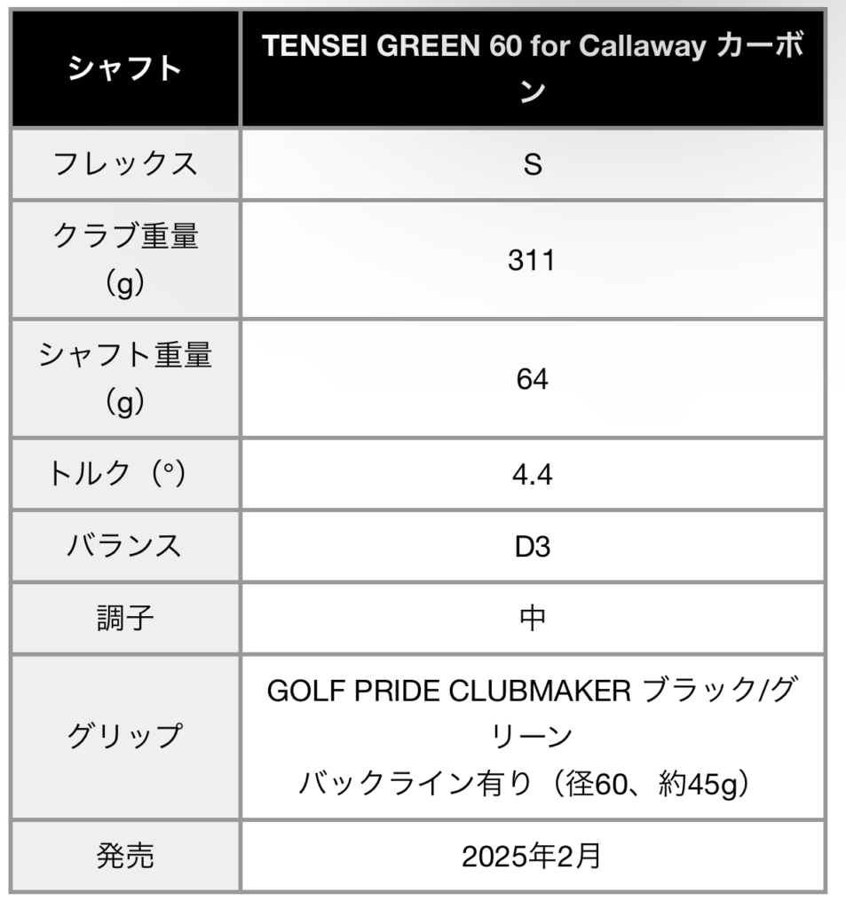 - TENSEI 60 for Callaway:中元調子で方向性と飛距離のバランスが良く、ヘッドスピード50でも安定して扱える