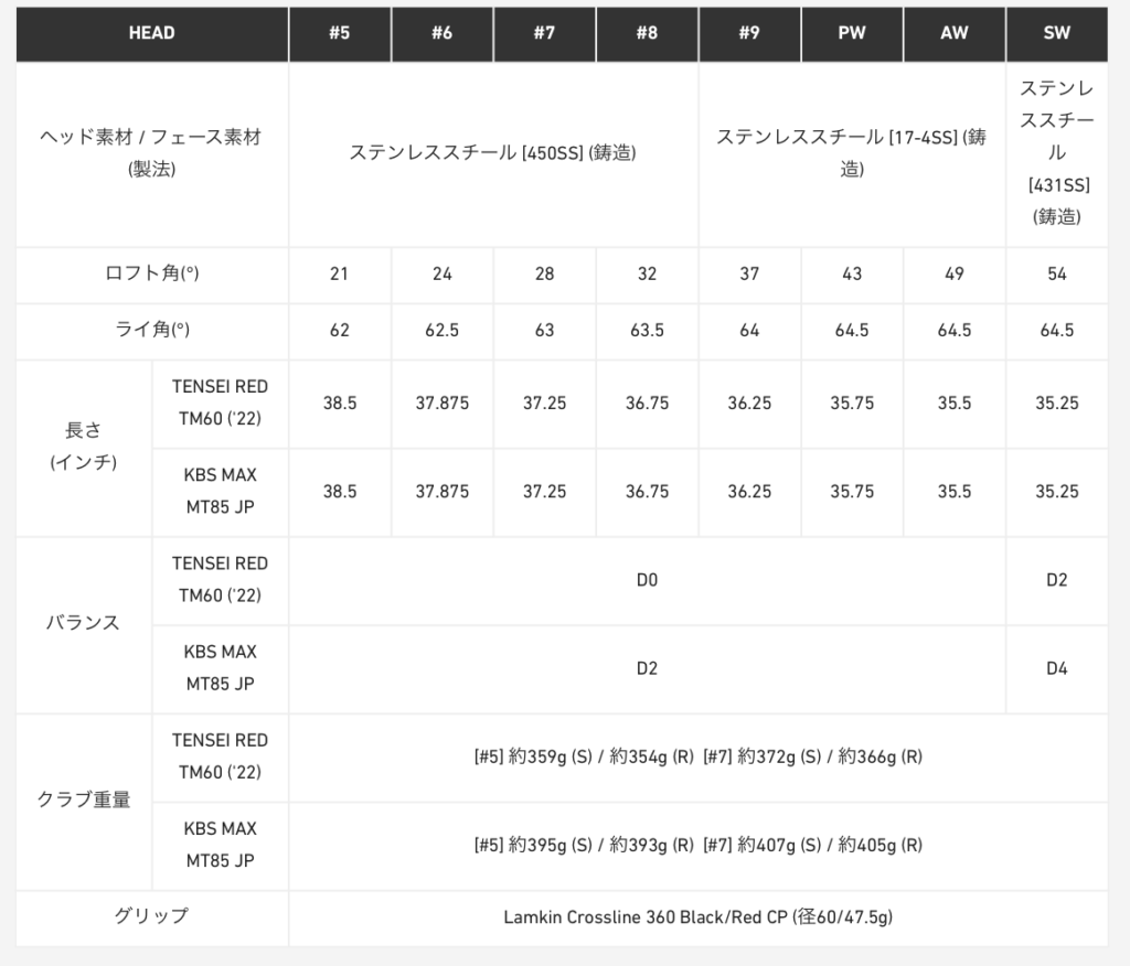 項目 | KBS(スチール) | TENSEI RED TM60(カーボン) |
