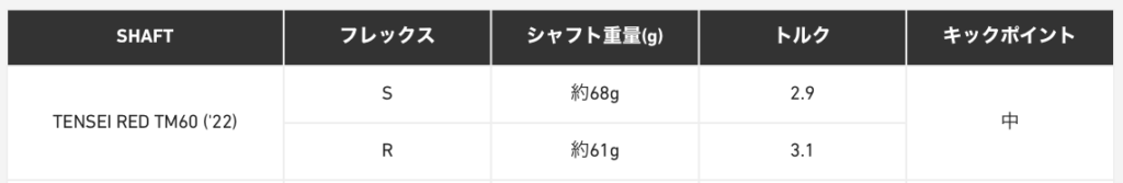 TENSEI RED TM60には、R・Sの2種類の主要フレックスが用意されています。それぞれの重量帯はおよそ59〜61g前後で、純正シャフトとしてはやや軽めですが、内部構造の最適化により十分な安定性を確保しています。以下は一般的なスペックの目安です(※テーラーメイド純正仕様による)。