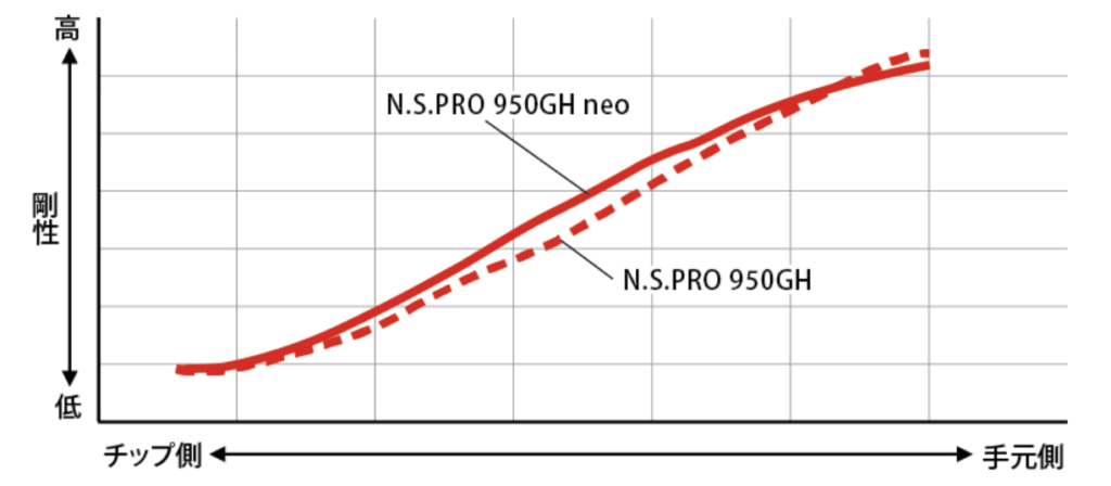 「NS PRO 950GH NEO」は、日本シャフトが従来の950GHを現代の大型ヘッドや高慣性モーメント設計に合わせてリファインしたモデルです。従来品と比べてトルクを抑え、やや手元側の剛性を強めており、インパクト時のブレを軽減しながら高い直進性を実現しています。
