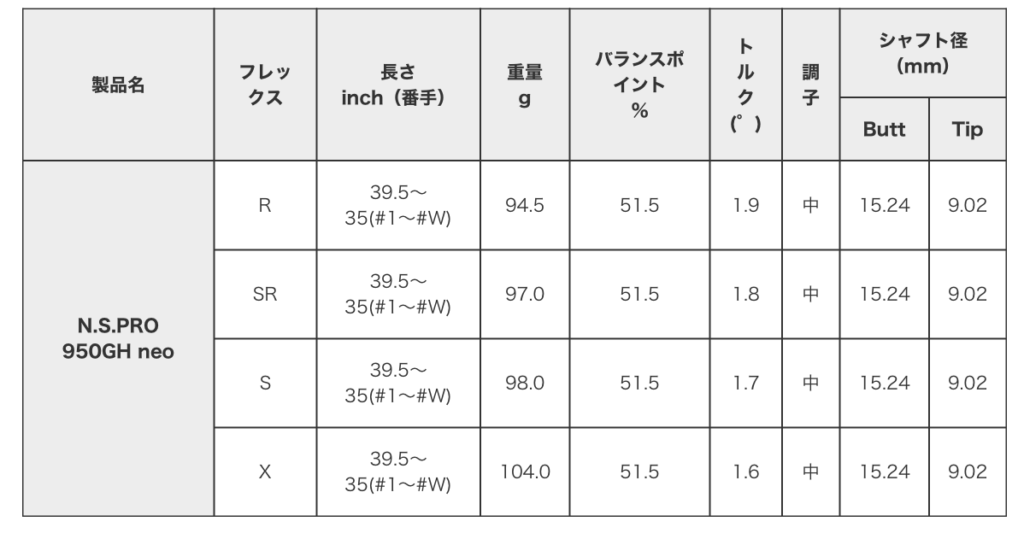 この表からも分かるように、950GHは軽量帯の中で最も自然な挙動を持ち、幅広い層に扱いやすい設計です。モーダスに比べて力感が少なくても弾道を安定させやすく、ダイナミックゴールドのような重厚なスイングが不要です。
