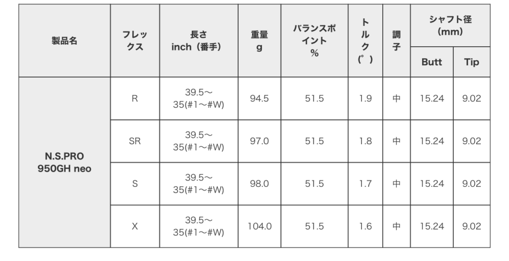 このデータから分かるように、850GH neoは非常に軽量なスチールシャフトです。Rで87g前後という重量は、カーボンシャフトとスチールシャフトの中間に位置する軽さで、スイングテンポが穏やかなプレーヤーや非力なゴルファーに適しています。Sでも約91gと軽く、一般的な950GH neoのRよりもわずかに軽量です。