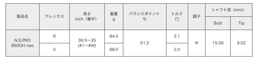 NS PRO 850GH neo は、軽量スチールシャフトの中でも特に「バランスの良い軽さ」と「先中調子寄りの中調子のしなり感」が特徴です。重量は、同社の 950GH neo よりも約10g 軽く設定されており、一般的なスチールシャフトを重く感じ始めたプレーヤーにとって、振りやすさと安定性の両立が期待できる設計になっています。