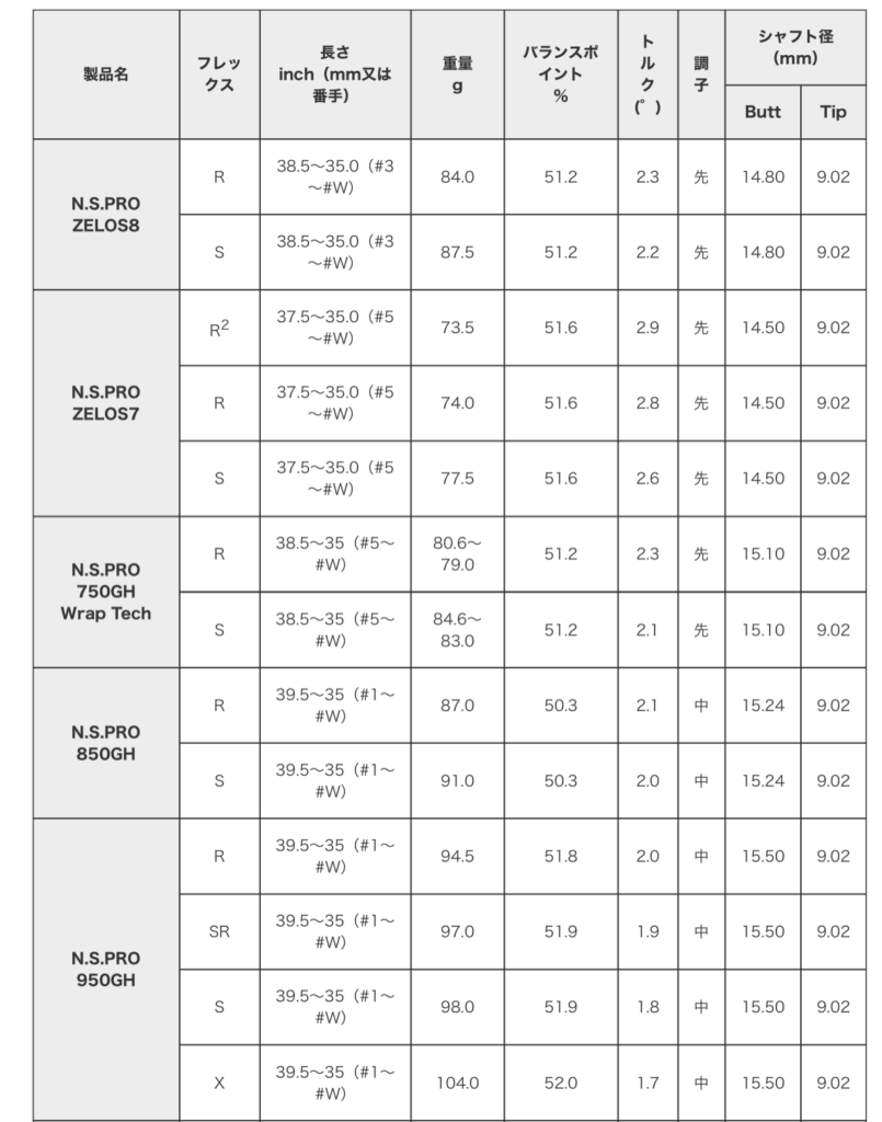 | NS PRO GTシリーズ | 現代のヘッドに合わせた最新設計 | 90〜100g台 | 中調子 | 中級者 |