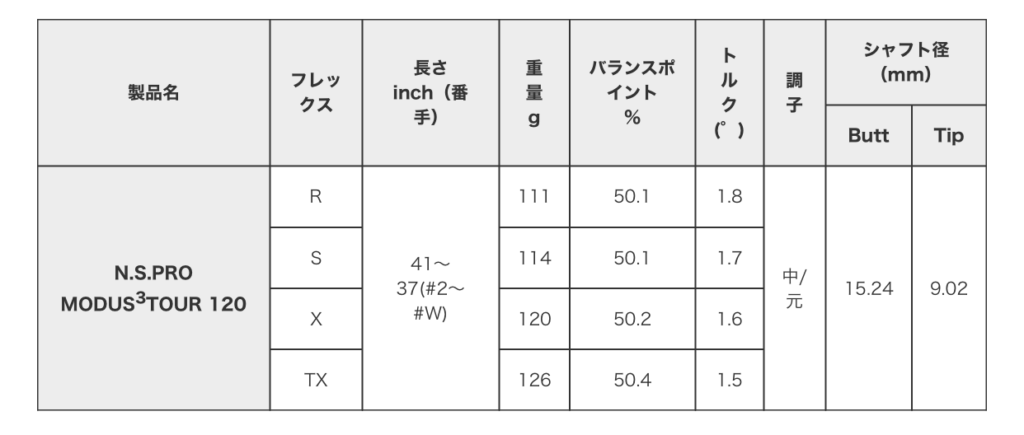 NS PRO MODUS3 TOUR120 の重量は、シャフトフレックスによって異なりますが、概ね114g〜120g前後 というスペックになります。これはメーカー公式スペックに基づいた数値です。一般的なスチールシャフトの中では「中重量帯」に分類され、軽量シャフト(NS PRO1050GH や モーダス105 など)よりも明確に重量があります。重量があることでヘッドの位置が感じやすく、しっかりとしたスイングテンポで振ることができます。