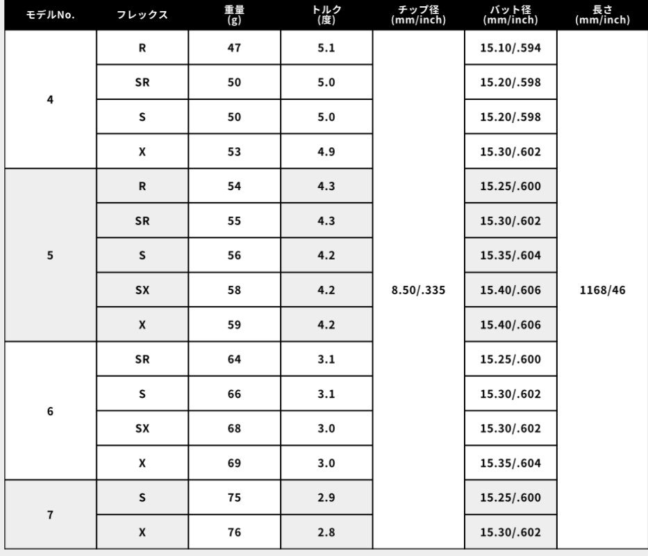- 5SX:42〜45m/s(叩いても安定・方向性向上)