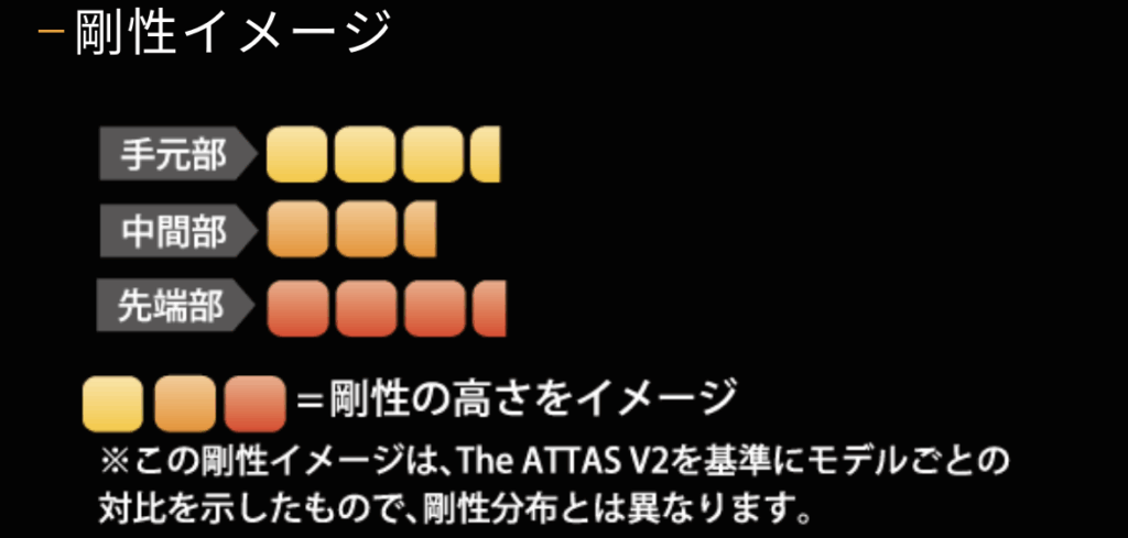 これらはアッタス V2 にも共通しており、スイングテンポが早めで、しっかり叩いて飛ばすタイプの選手に適しています。