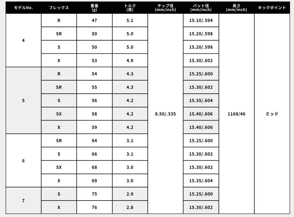ヘッドスピード帯では、42〜45m/sを中心に幅広く適応し、しなり量と戻りスピードのバランスが良いため、パワーが強すぎなくてもシャフトの動きをしっかり感じながら振れるのも特徴です。5Sは軽快で走りを強く感じやすく、5SXはしなり量を程よく抑えて安定性が増し、6Sは中〜強めのヘッドスピードで振っていってもブレが少ないため、番手ごとに狙いどころが分かりやすいラインナップになっています。適正さえ合えば、弾道は安定しやすく、曲がり幅も抑えられる傾向があるため、先中調子で飛距離を伸ばしつつ方向性も確保したいゴルファーにとって、非常に使い勝手が良いシャフトです。