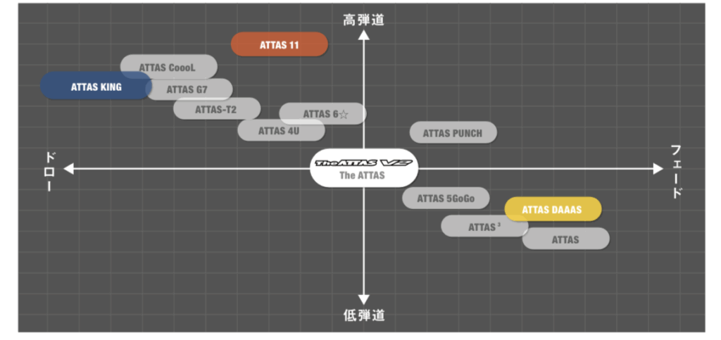 このように、アッタスシリーズはモデルごとの性格が非常に分かりやすいため、分布図を見て自分のスイングの不足部分を補う形で選ぶとミスマッチが起きにくくなります。万能型・つかまり型・強弾道型・コントロール型とカテゴリーごとに明確な特徴があるため、自分のプレースタイルを基準に選ぶことが最も理想的です。