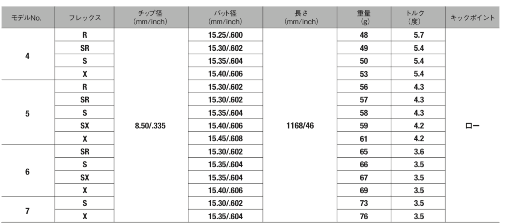 モデルごとに調子が違うのは、シャフトの剛性分布(EIカーブ)が異なるためです。同じ重量帯でも調子が違えば挙動がまったく異なり、球の高さ・つかまり・初速・スピン量まで変化します。このため調子選びはシャフト選びの最重要ポイントと言えます。
