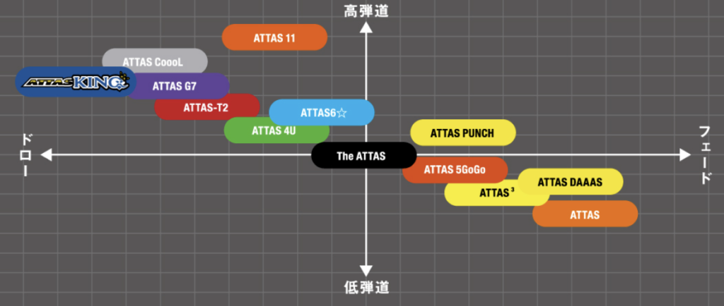 アッタスキングは中間部〜先端側の返りが強いため、低スピンヘッドと組むと“吹き上がらずに強い中弾道”が出しやすく、最も飛距離が伸びる組み合わせです。