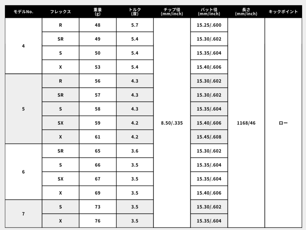 5SXは5Xよりもさらに振動数が高く、重量と剛性のバランスも相まって、かなりハードな部類に入ります。振動数だけを見ると極端に高い数値になる場合もありますが、実際には中元調子による粘り感が残るため、「ただ硬いだけ」では終わらないのが特徴です。ただし明確にオーバースペックになると、打ち出し角の低下や右方向へのミスが増えやすくなります。
