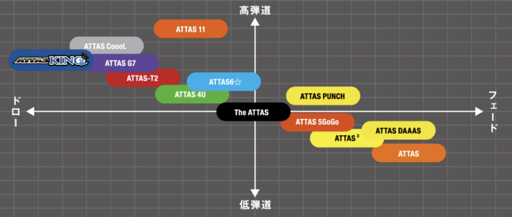 アッタスシリーズは全体的に「フレックス表記よりも中身を重視する」設計が特徴です。単に柔らかく感じさせるのではなく、剛性配分によって振りやすさや再現性を作る思想があり、振動数はその結果として表れます。そのため、アッタスシリーズは数値を把握して選ぶほど失敗が少ないと言われています。