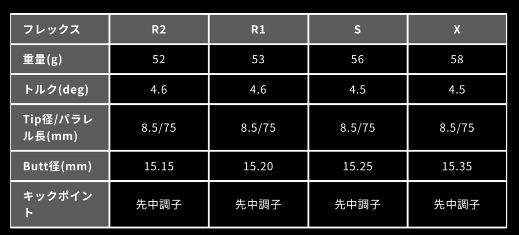 スペック展開も非常に幅広く、40g台の「R2」から70g台の「X」まで用意されているため、非力なシニアゴルファーからパワーのあるハードヒッターまで、あらゆる層が「先中の加速感」を享受できる設計になっています。
