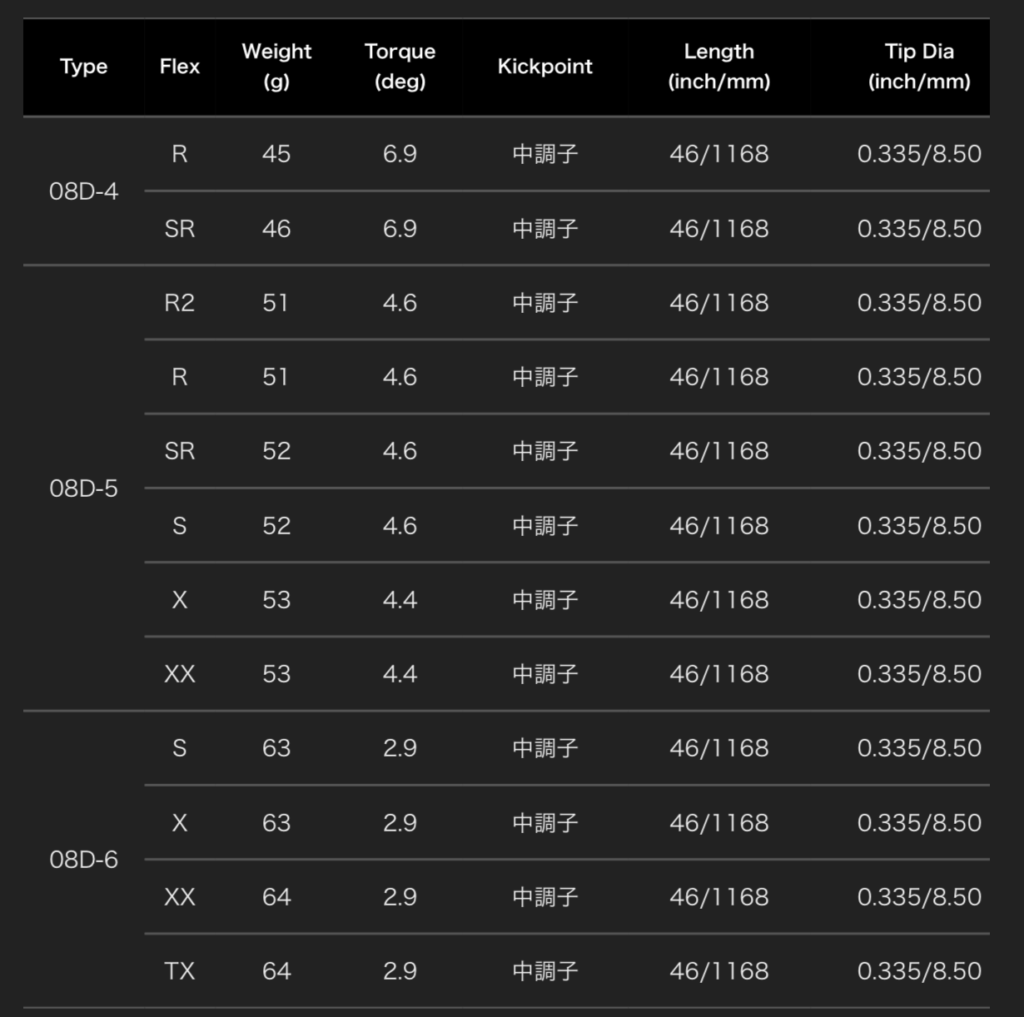 デラマックス08Dは、一般的なシャフトと比較して「軽量でありながら振動数が高めに出る」という傾向があります。これは、高弾性素材を贅沢に使用しているため、シャフト自体の復元力が非常に強いためです。