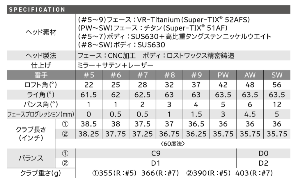| 番手 | ロフト角 | ライ角 | 長さ |