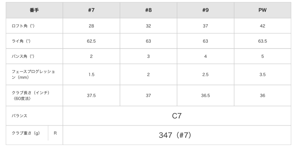 ロフト34°の7番アイアンは、飛距離よりも高さとスピン安定性を重視する設計です。ヘッドスピード38m/s前後でキャリー130〜140ヤードが目安になります。