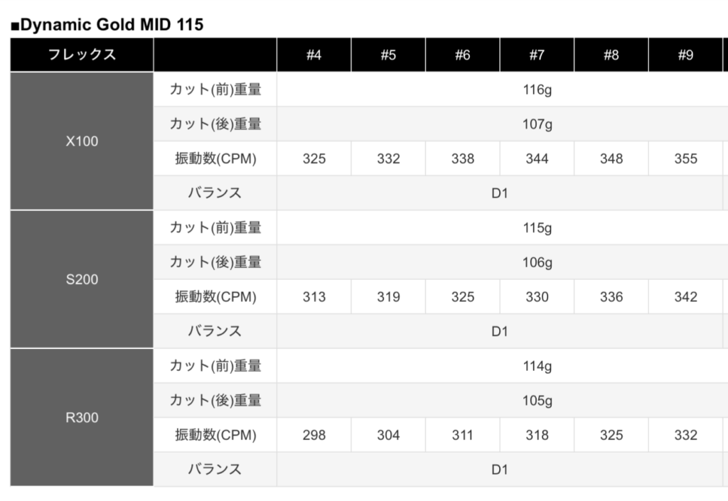 ダイナミックゴールドシリーズを検討していると、105と比較対象としてよく名前が挙がるのが「Dynamic Gold MID 115」です。MID115は名前の通り115g前後の重量帯に設計されたモデルで、105と120の中間的なポジションにあります。ただし、シャフト重量を考える際に注意すべきなのは「カット前重量」と「カット後重量」です。実際にクラブに組み込まれた状態ではシャフトはカットされるため、表示されている重量より軽くなります。ここではMID115のカット後重量を中心に、ダイナミックゴールド105との違いを整理していきます。