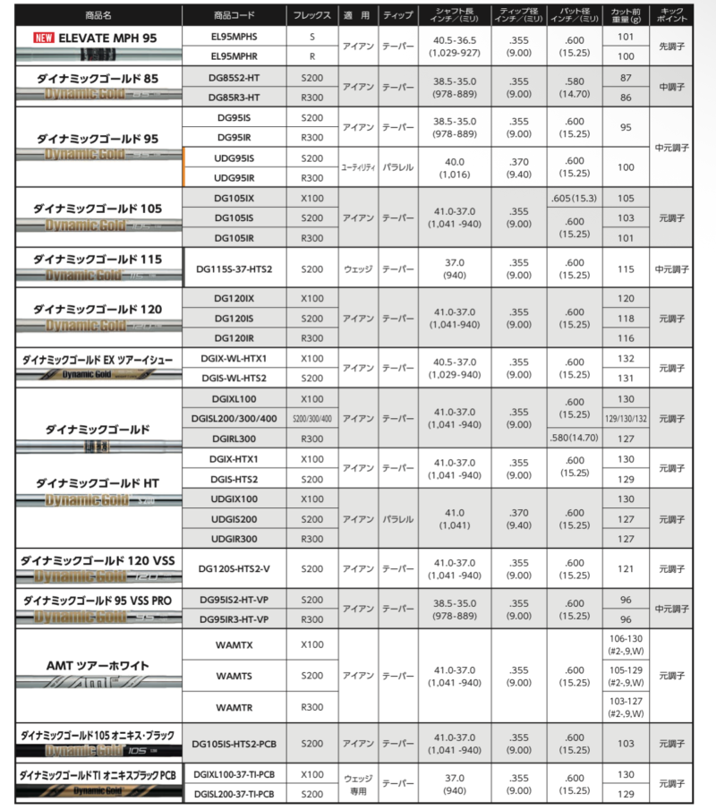 シャフト重量が10g変わると、スイング中の体感重量は大きく変わります。重いシャフトは「クラブに仕事をさせる(自重で下ろす)」スイングを促し、軽いシャフトは「自分の筋力でコントロールする」スイングになりやすい傾向があります。 論理的に考えれば、ダイナミックゴールドのラインナップは、この「自重による加速」と「操作性」のバランスを、どの重量帯でも損なわないように設計されていることが、この比較表からも見て取れます。