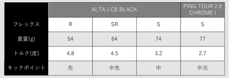 公式サイトの分析によれば、65Rは「ALTA J CB BLUE」のSフレックスよりも硬いシャフトとして位置づけられています。ALTAが50g台の軽量でしなりを重視しているのに対し、65Rは55gの重量がありつつ、トルクを4.4に抑えています。