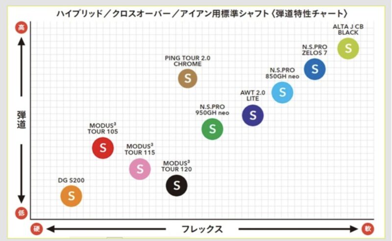 また、ツアーADやディアマナといったカスタムシャフトの中で、クロームに近い挙動を持つモデルとの比較表を提示。ヘッドスピード40m/sから50m/s超えのゴルファーまで、どのスペックが「似た振り心地」になるのかを論理的な因果関係から導き出します。